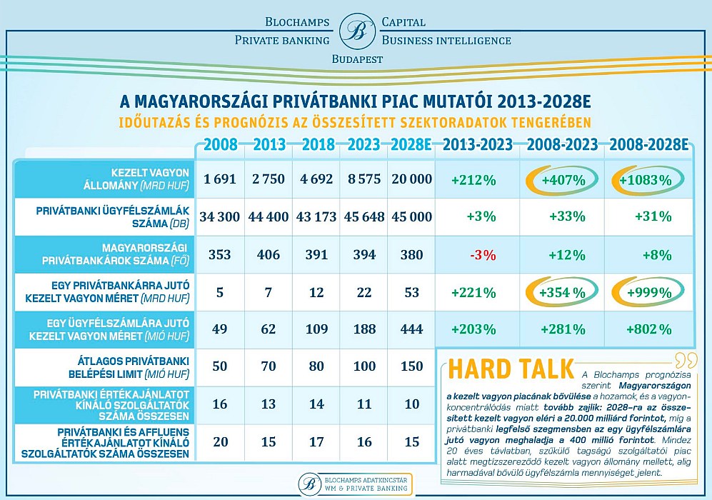 Alapjaiban változik meg a következő öt évben hazai privátbanki piac: a magyar elitet kiszolgáló pénzügyi szolgáltatókra bízott vagyon az összege a következő fél évtizedben bő duplájára emelkedik és a 2024 eleji 9000 milliárd forint után 2028-ra átlépi a 20 ezer milliárd forintos álomhatárt. A Konferenciát szervező Blochamps Capital privátbanki tanácsadó cég ügyvezető igazgatója, Karagich István szerint a növekedés egyértelműen annak lesz köszönhető, hogy a magyar gazdaság vállalkozói szerkezetének átalakulásával egyre több jel alapján megállapítható, bármilyen gazdasági fellendülési vagy beruházási vitalizálódás okozta vagyonbővülés a korábbiaknál is erőteljesebben koncentrálódik majd arra a legvagyonosabb ügyfélkörre, akik az elmúlt évtized során messze az átlag fölött bővítették már így is vagyonukat és befolyásukat a magyar gazdaság működésére. A szakember szerint ehhez már nem is kell a kvázi-oligarchák felé lejtő, megkérdőjelezhető megbízásokról vizionálni: a magyar topgazdagok cégei, szolgáltatásai csaknem minden olyan üzletágban megkerülhetetlenné váltak, amely iparágak egy gazdasági beruházási bővülés esetén a leggyorsabban profitálnak a fellendülésből.